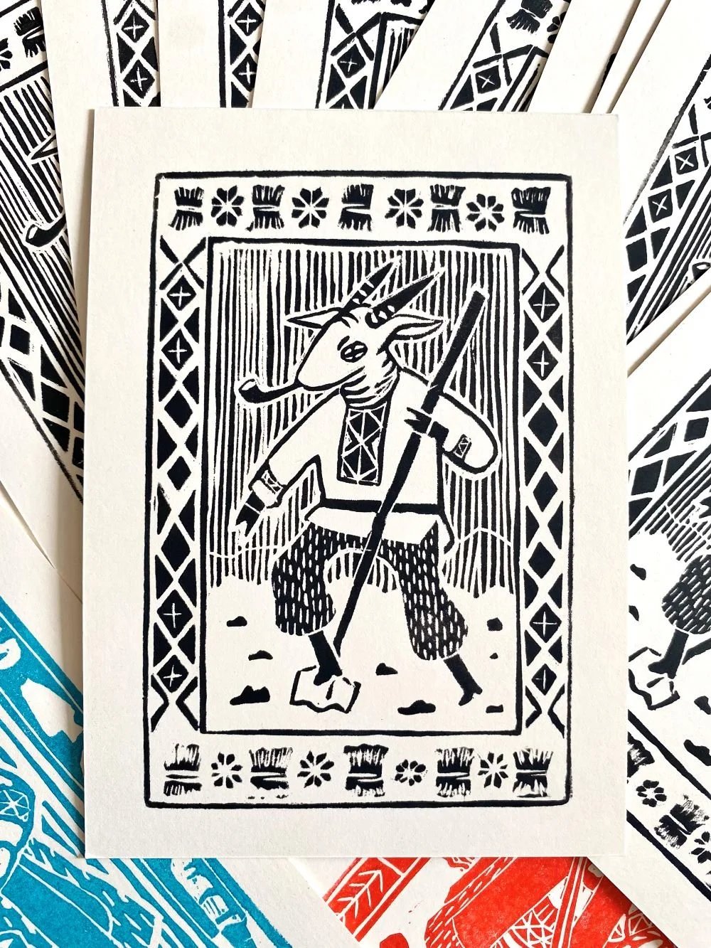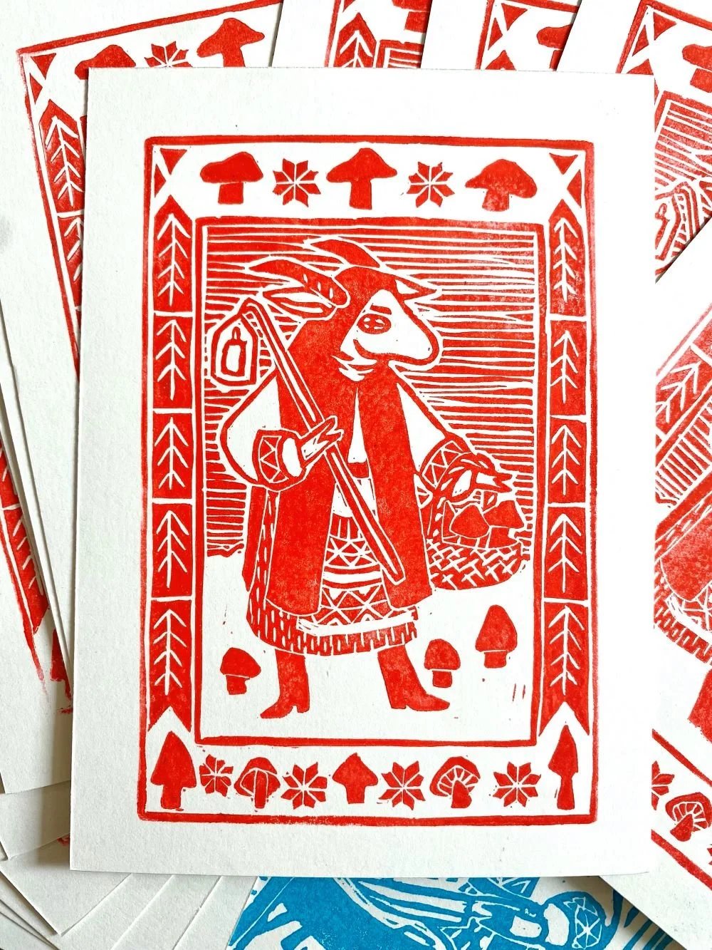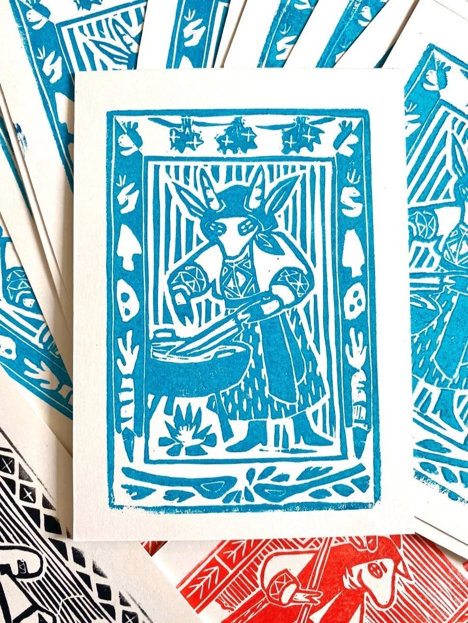 Inspired by traditional craft, these lino prints offer a delightful mix of folk and gothic themes.